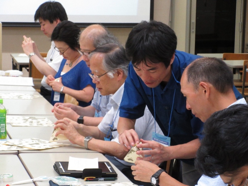 - この地図の立体的な仕組みを知るために参加者が各自、地図の仕組みがわかるペーパークラフトを組み立てます。製作しながら本当に重要な質疑を誘発することが目的です。実際に造り方から質問が始まり、重要な質問が相次ぎました。正四面体の頂点の位置はどうやって決めた?ずらすとこうなるのか?など。