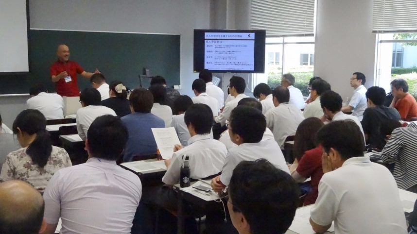 そしてこの日のメインメニューである「ある生協のPC講座」の架空ケースを題材としたワークを行いました。このケースも講師の指示のもとステップバイステップで進めていく一斉授業スタイルのものです。参加者はレッスンプランを読んだ上で、ここまでに学んだモデルや理論を用いてワークシートに評価と理由、思いついた改善アイディアを記入し、周囲の人とディスカッションし、改善アイディアを出し合いました。