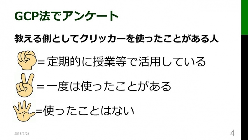 セッションは、司会からの全体説明の後、4つの班に分かれ、それぞれの班で1社のクリッカーの使い方をマスターし、全体で模擬授業を実施する流れで実施した。最後にクリッカーシステムの良い点、改善点について意見交換を行った。参加人数は13人と少なかったものの、普段使ったことのないクリッカーを直接操作し、使い勝手を確認できたのは有意義な試みであったと考える。また協力いただいたベンダー様からも、「実際のエンドユーザーの声が聴けた」等好意的な意見を数多くいただいた。